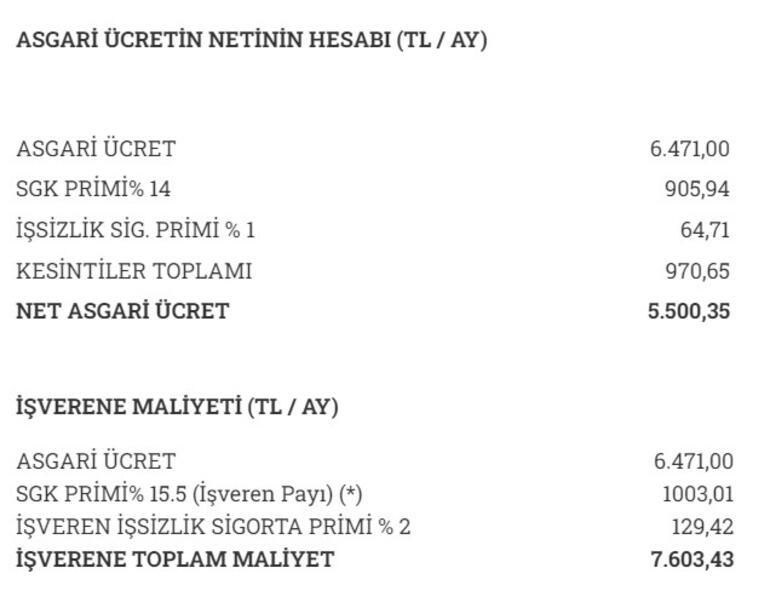 Brüt asgari ücret: 6.471 TLNet asgari ücret: 5.500 TLAsgari ücretin işverene maliyeti: 7.600,43 TL