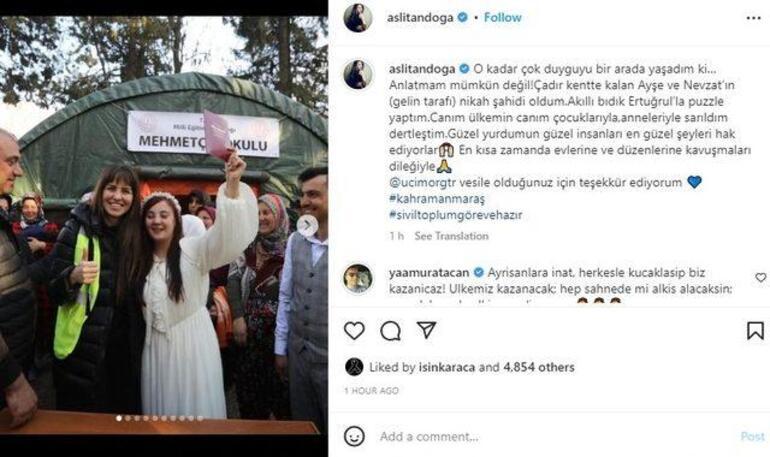 Kahramanmaraş’ta depremzede bir çift Ayşe ve Nevzat’ın nikah şahitliğini yaptığı anları paylaşan oyuncu duygu dolu anlar yaşadı, yaşattı.