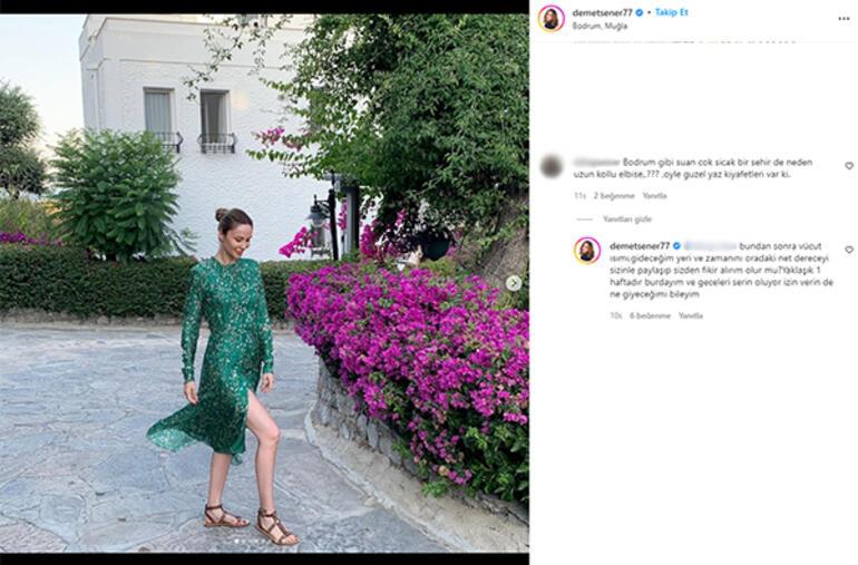 Takipçisine kayıtsız kalamayan Demet Şener ise “Bundan sonra vücut ısımı, gideceğim yeri ve zamanını oradaki net dereceyi sizinle paylaşıp sizden fikir alırım olur mu? Yaklaşık bir haftadır buradayım ve geceleri serin oluyor izin verin de ne giyeceğimi bileyim” şeklinde yanıt verdi.
