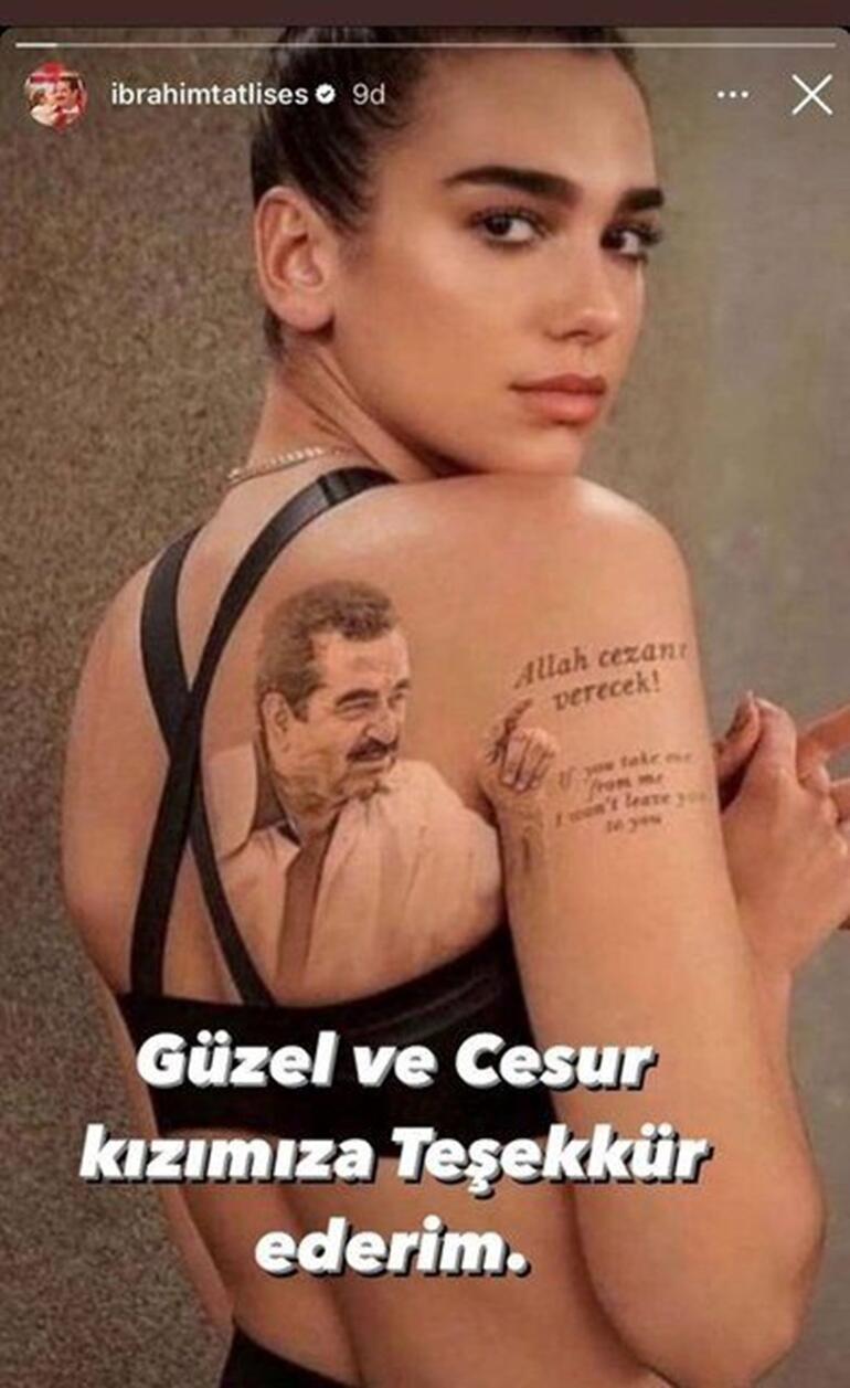 Bir sosyal medya kullanıcısı İngiliz şarkıcı Dua Lipa’nın sırtına İbrahim Tatlıses’in fotoğrafını koyup, dövme gibi gösterdi. Aynı zamanda ‘İmparator’ lakaplı sanatçı Tatlıses’in en çok kullandığı kelime olan ‘Allah cezanı verecek’ sözünü de photoshopla Lipa’nın koluna ekledi.