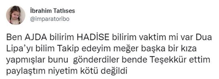 “Ben Ajda Pekkan bilirim, Hadise bilirim” diyen Tatlıses, “Vaktim mi var da Dua Lipa’yı bileyim, takip edeyim? Meğer başka bir kıza yapmışlar, bunu gönderdiler. Ben de teşekkür ettim, paylaştım. Niyetim kötü değildi” şeklinde konuştu.