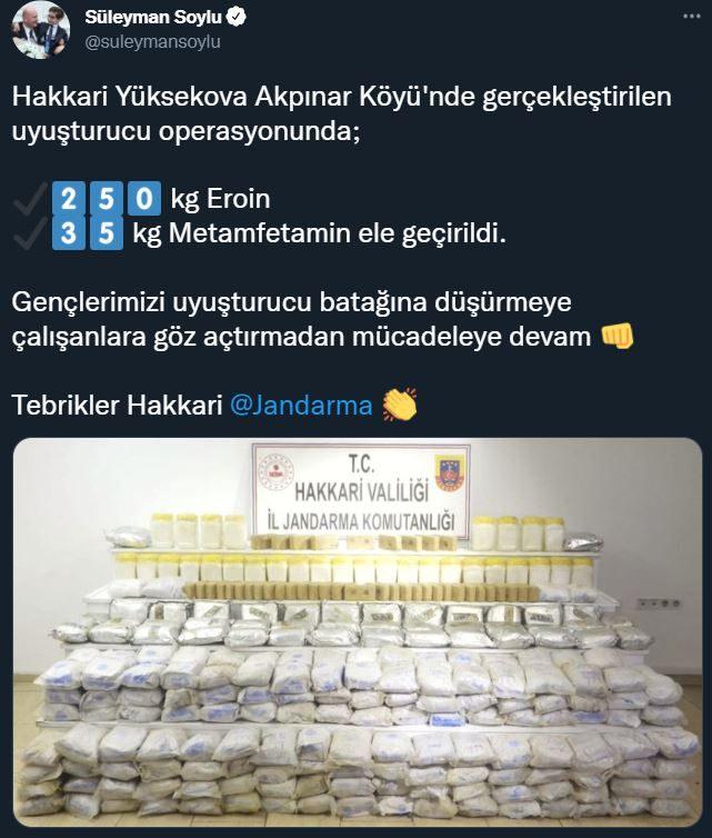 Hakkari Yüksekova Akpınar Köyü’nde gerçekleştirilen uyuşturucu operasyonunda; 250 kg eroin 35 kg Metamfetamin ele geçirildi. Gençlerimizi uyuşturucu batağına düşürmeye çalışanlara göz açtırmadan mücadeleye devam. Tebrikler Hakkari Jandarma komutanlığı.
