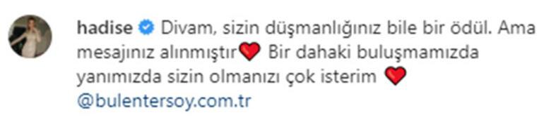 Bülent Ersoy, söz konusu paylaşımı kıskandığını esprili bir yorumla takipçilerine belli etti: Haluk şimdi bir resim geldi telefonuma. Bana inat mı koydunuz o resmi? Hadise Hanım’la yanak yanağa poz vermişsiniz. Bu Hadise Hanım da aslında iyi bir kızdır. Gerçekten çok sevdiğim iyi bir çocuktur ama bu kadar ziyadesiyle sana yaklaşmasından sonra kendisine olan iyi niyetli, sevecen yaklaşımlarım ve iyi niyet fikirlerim her an pozisyonumun değişmesine sebep olabilir.