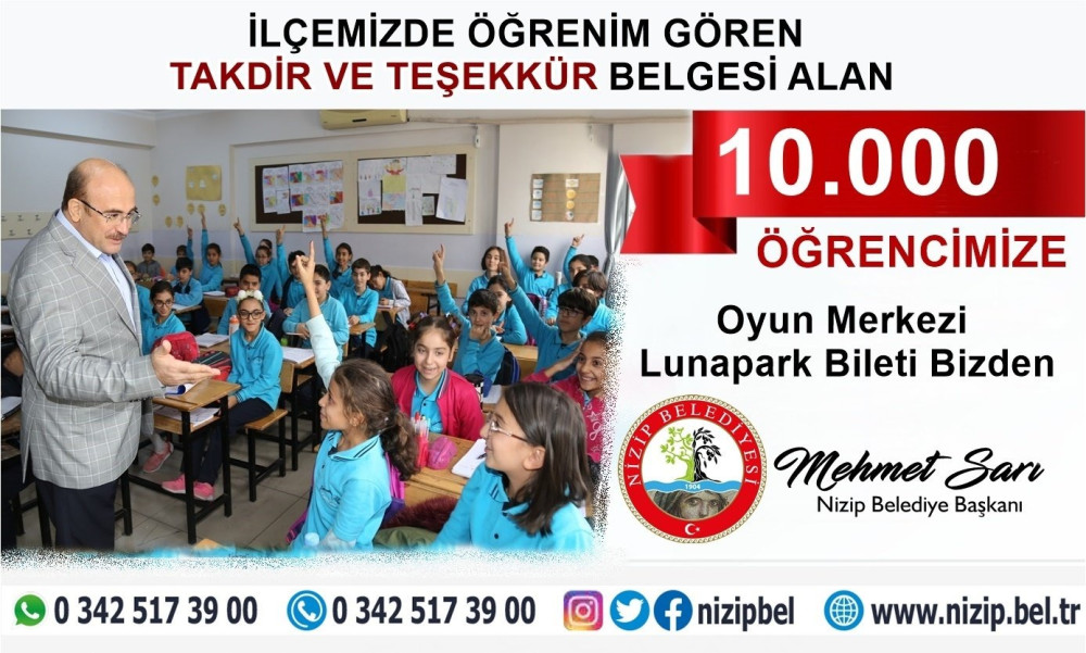 Nizip Belediyesi, takdir ve teşekkür alacak olan 10 bin öğrenciye ”Oyun Merkezi Lunapark Bileti” edecek