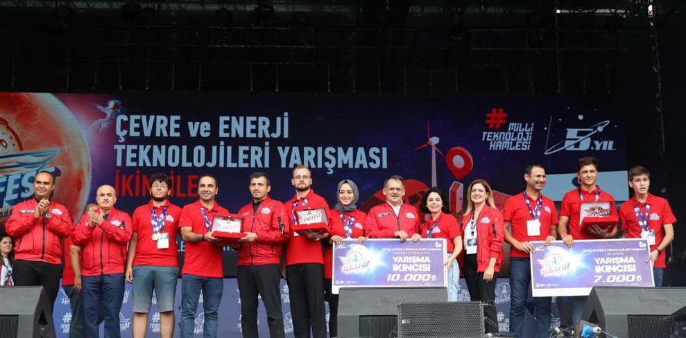 Çevre ve Enerji Teknolojileri Yarışmasında birincilik kazanan takımlar ödüllerini Cumhurbaşkanı Recep Tayyip Erdoğan’ın elinden alırken, ikinci ve üçüncü olan takımlara ise ödüllerini Samsun Valisi Zülkif Dağlı, Belediye Başkanı Mustafa Demir, Sanayi ve Teknoloji Bakan Yardımcısı Mehmet Fatih Kacır, TEKNOFEST Yönetim Kurulu Başkanı Selçuk Bayraktar ve SANKO Holding Kurumsal İletişim Direktörü Pınar Ulutaş birlikte takdim etti.