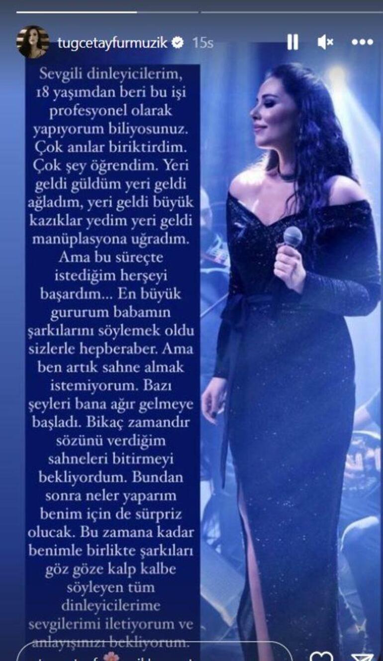 Tuğçe Tayfur, geçtiğimiz günlerde ise sosyal medya paylaşımıyla gündeme geldi. Sahneyi bıraktığını açıklayan Tayfur, paylaşımında şu ifadeleri kullandı: