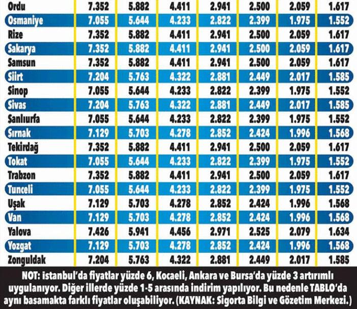 Ağustos itibarıyla İstanbul’da trafiğe yeni çıkan araç için (4’üncü basamak) uygulanan azami prim tutarı 3 bin 149 olacak. Yine İstanbul’da son 2-3 yıldır hiçbir kazaya karışmamış ve 7’nci basamağa yükselmiş bir sürücü, bu ay sigortasını yenilediğinde en fazla 1.732 lira ödeyecek. Sigorta Bilgi ve Gözetim Merkezi’nin açıkladığı liste tavan fiyatları ifade ediyor.