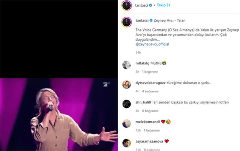 Tan’ın Ekim 2021’de Instagram hesabından paylaştığı tebrik mesajı: The Voice Germany’de (O Ses Almanya) ‘Yalan’ ile yarışan Zeynep Avcı’yı başarısından ve yorumundan dolayı kutlarım. Çok duygulandım.